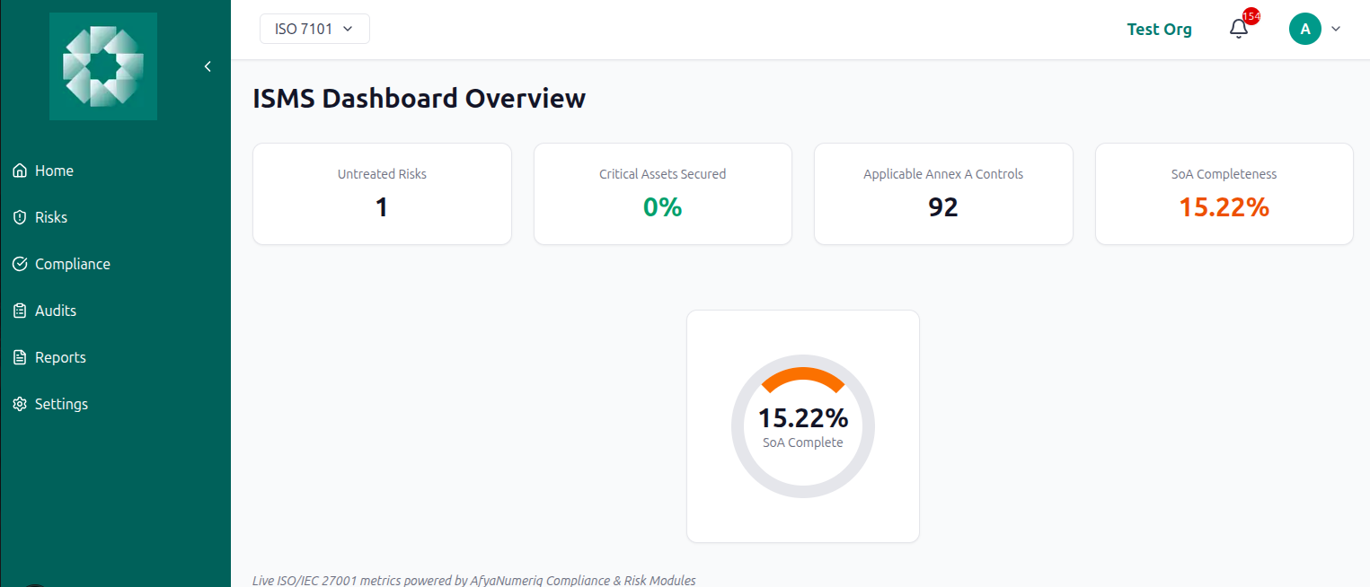 AfyaNumeriq is a Governance, Risk, and Compliance (GRC) platform designed specifically for healthcare organizations. It helps providers comply with ISO 7101:2023 standard while preparing them to scale into additional standards that are critical for healthcare, laboratories, and information security.